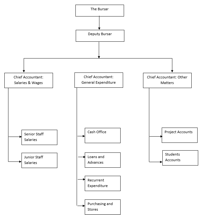 The finances of the College shall be under the direct management and supervision of the bursary department. This department shall be charged with the responsibility for budget preparation, expenditure control, and to provide financial advice for the College. It shall also provide support services for the management of assets and other resources as well as the liabilities of the institution. The head of this department shall be the Bursar. The department shall perform its functions through the following offices: