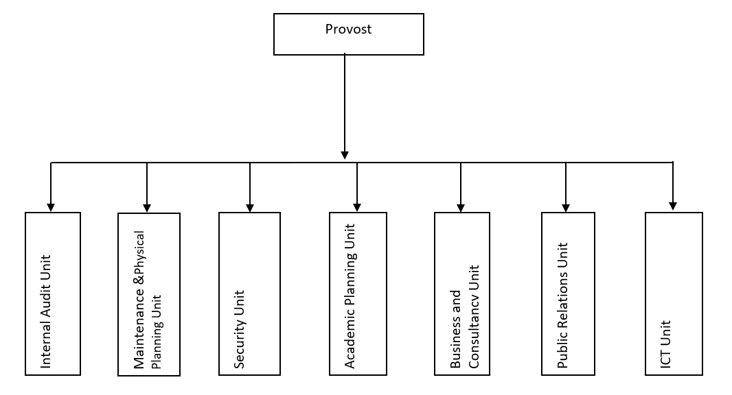 The Provost Office shall be the main academic and administrative organ of the institution. The headship of this department shall be the Provost who shall be the Chief Executive Officer of the Proposed Institution. The image below shows Sections and units that shall make up the Provost office: